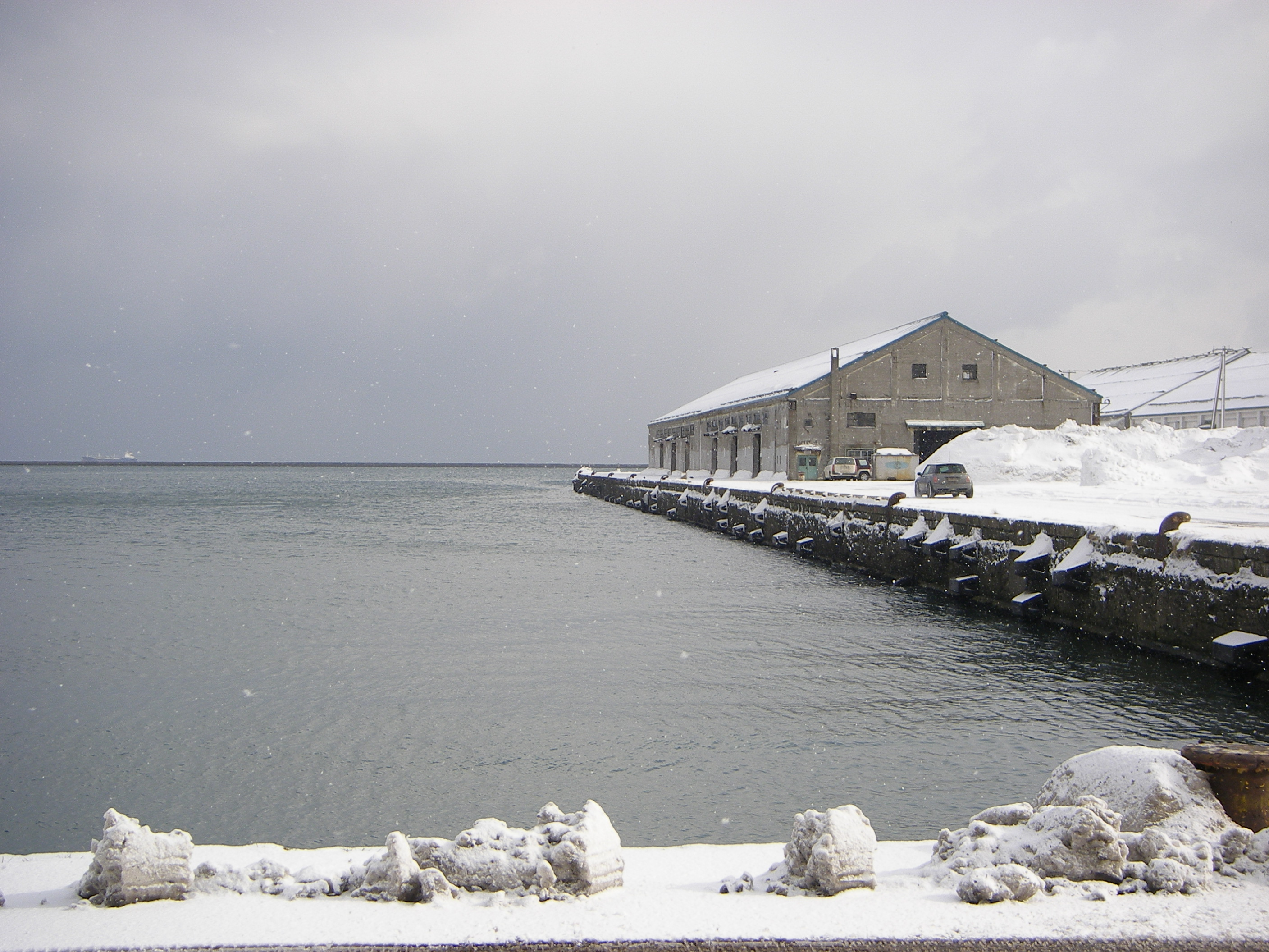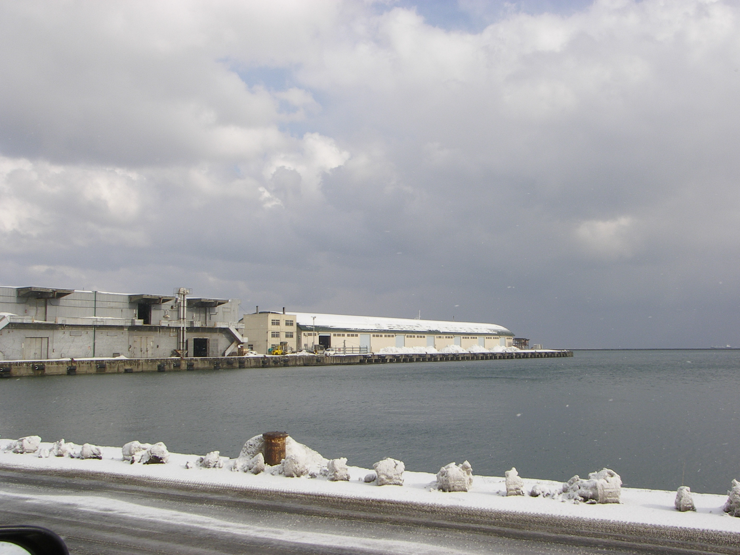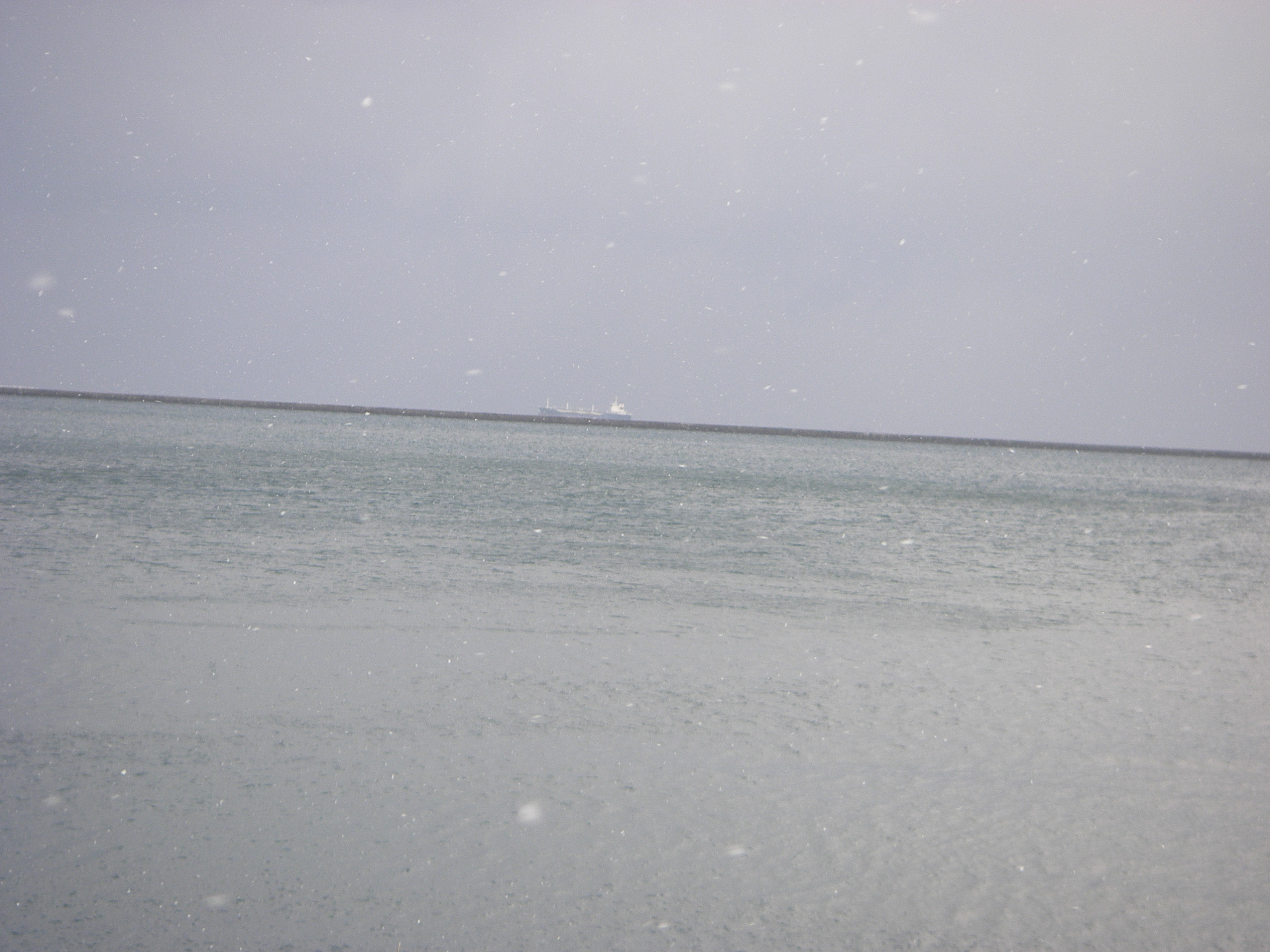 防波堤には雪が積もり、海のはるかかなたにはフェリーらしき船が・・・・・・。