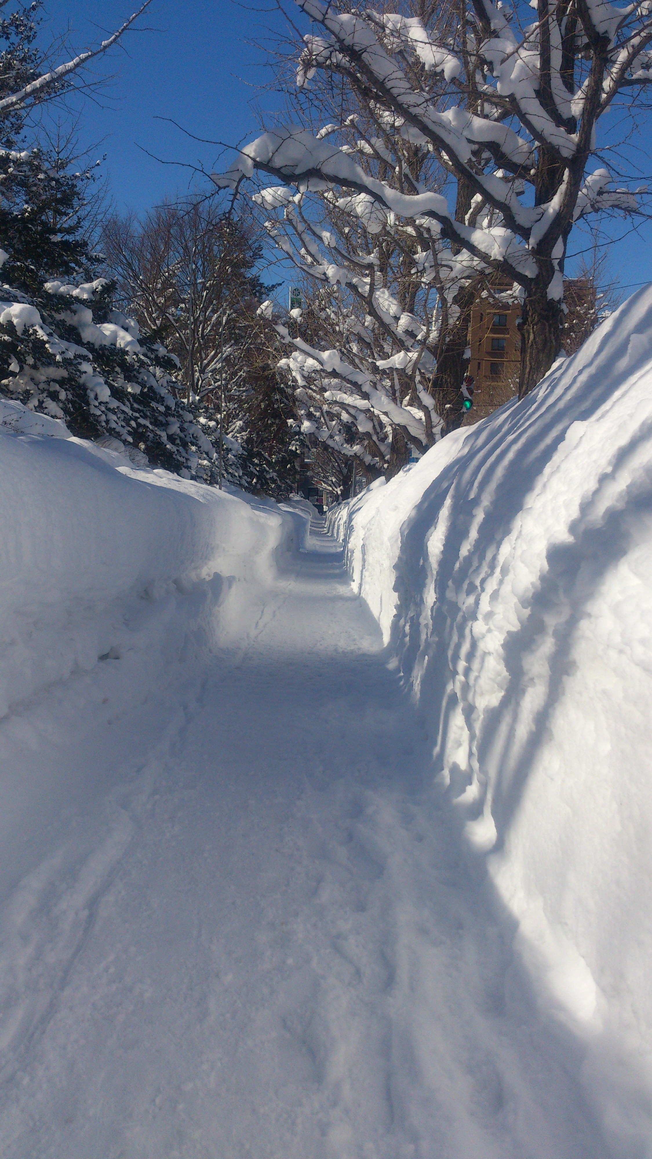 車道が全く見えないくらい歩道の両側に雪が降り積もっておりました。