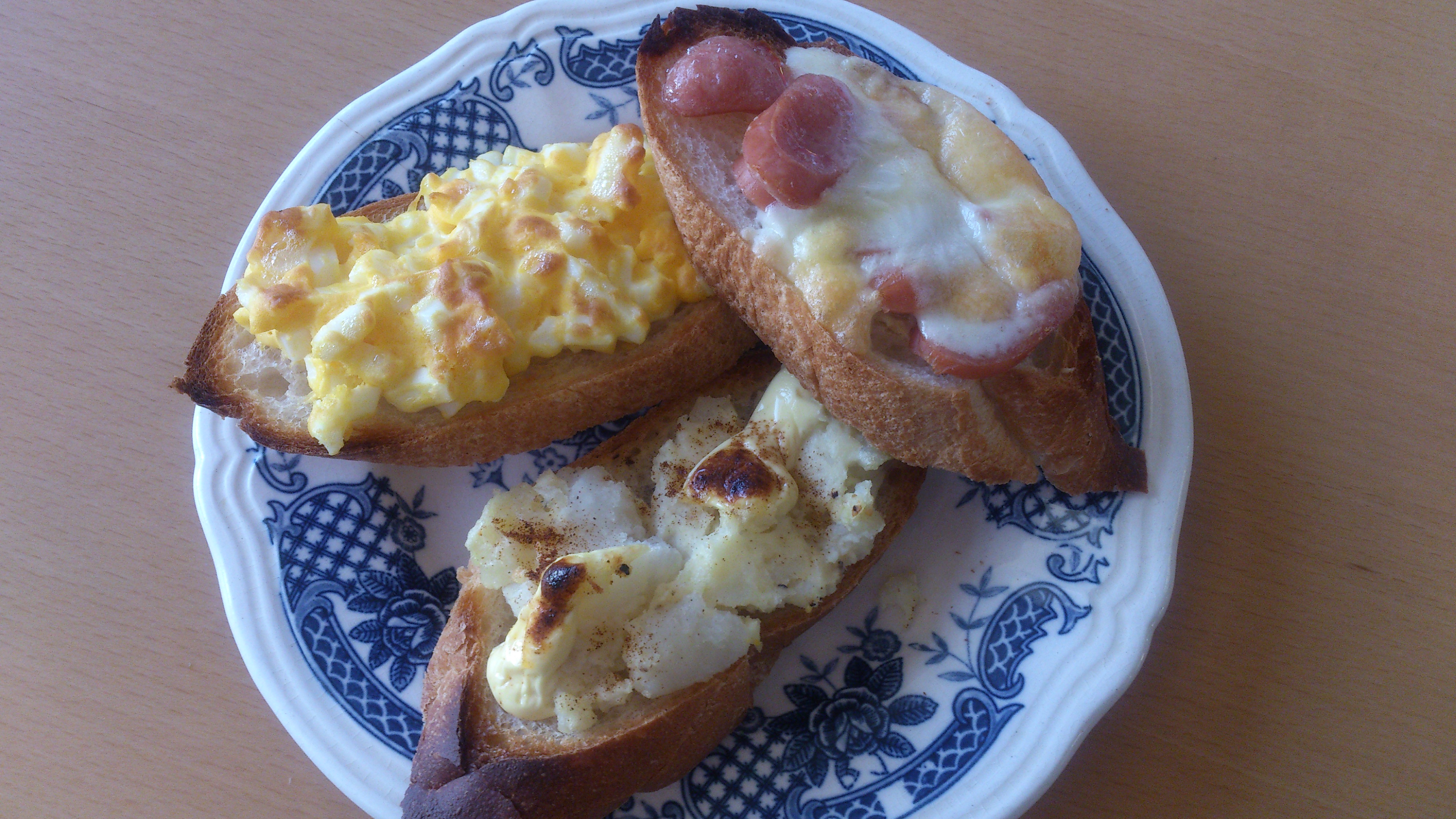 ・それぞれを薄めに切ったパンに載せ、ソーセージのところにはピザ用チーズをのせオーブントースターへ