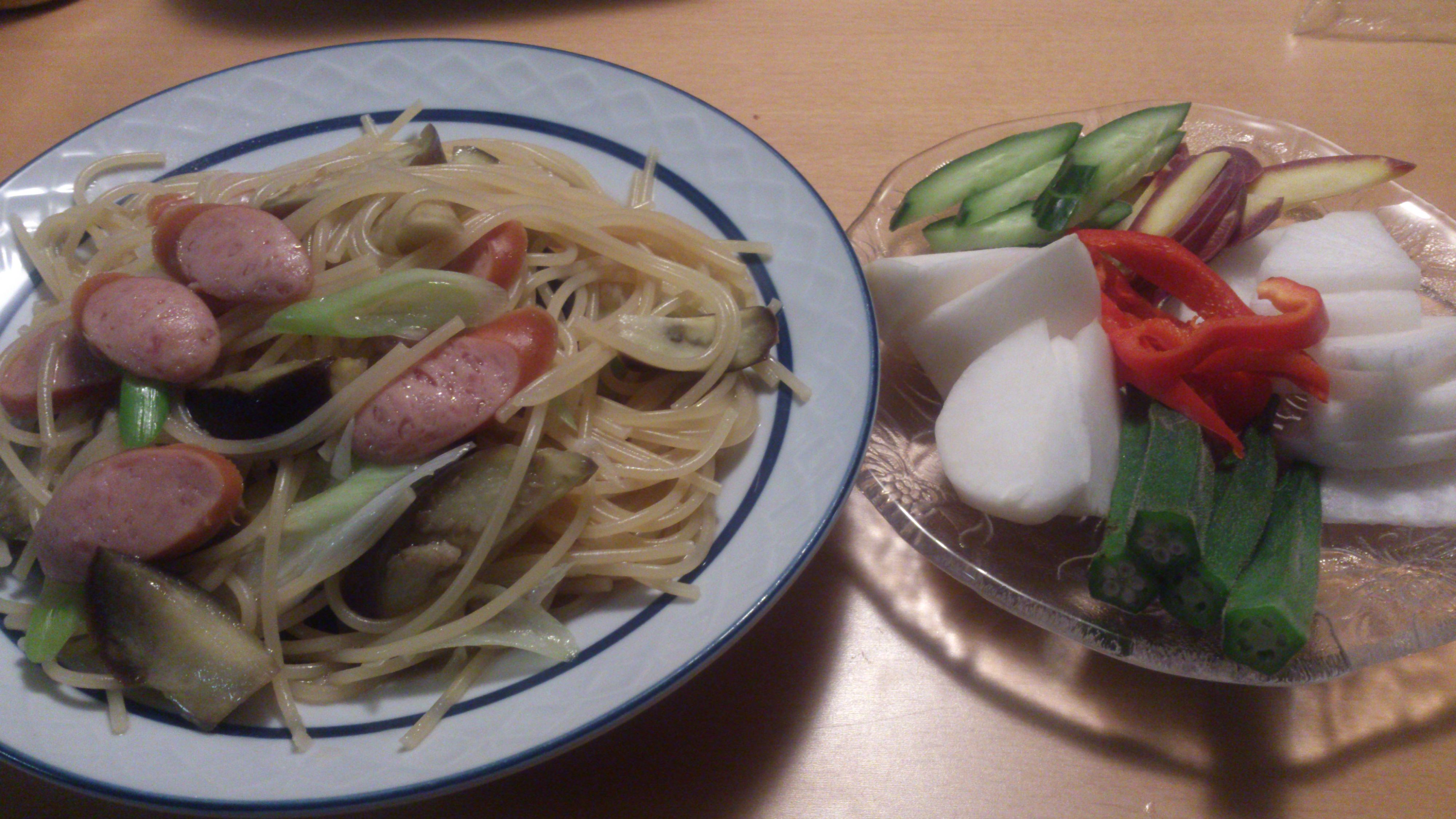 ・パスタ・ナス・ソーセージ・長ネギ・めんつゆ・塩コショウ・バター・わさび