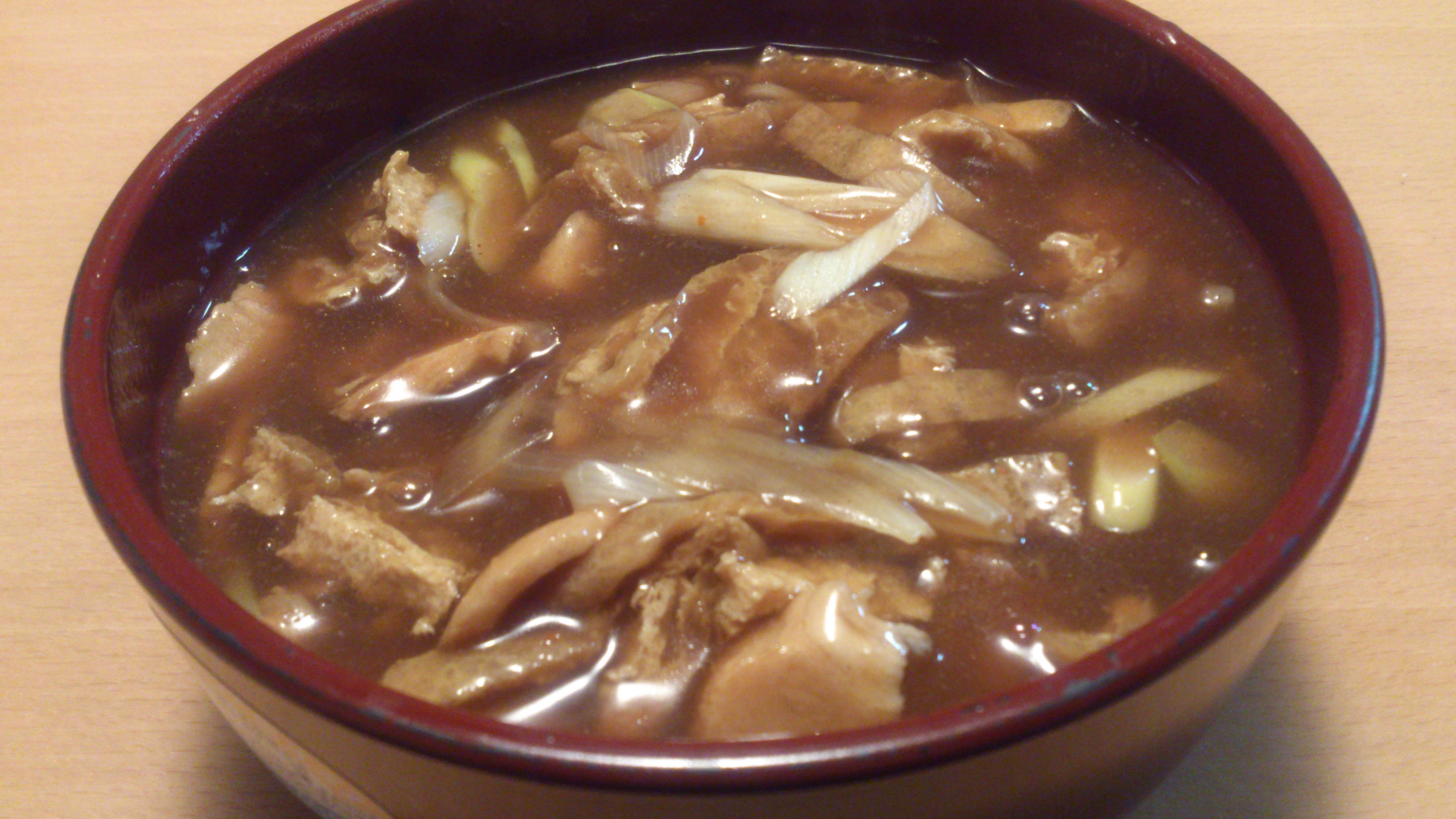 ゆでそば・市販のカレールー(1/4)・麺つゆ・長ネギ・ささみ・七味・小揚(1枚)・水溶き片栗粉