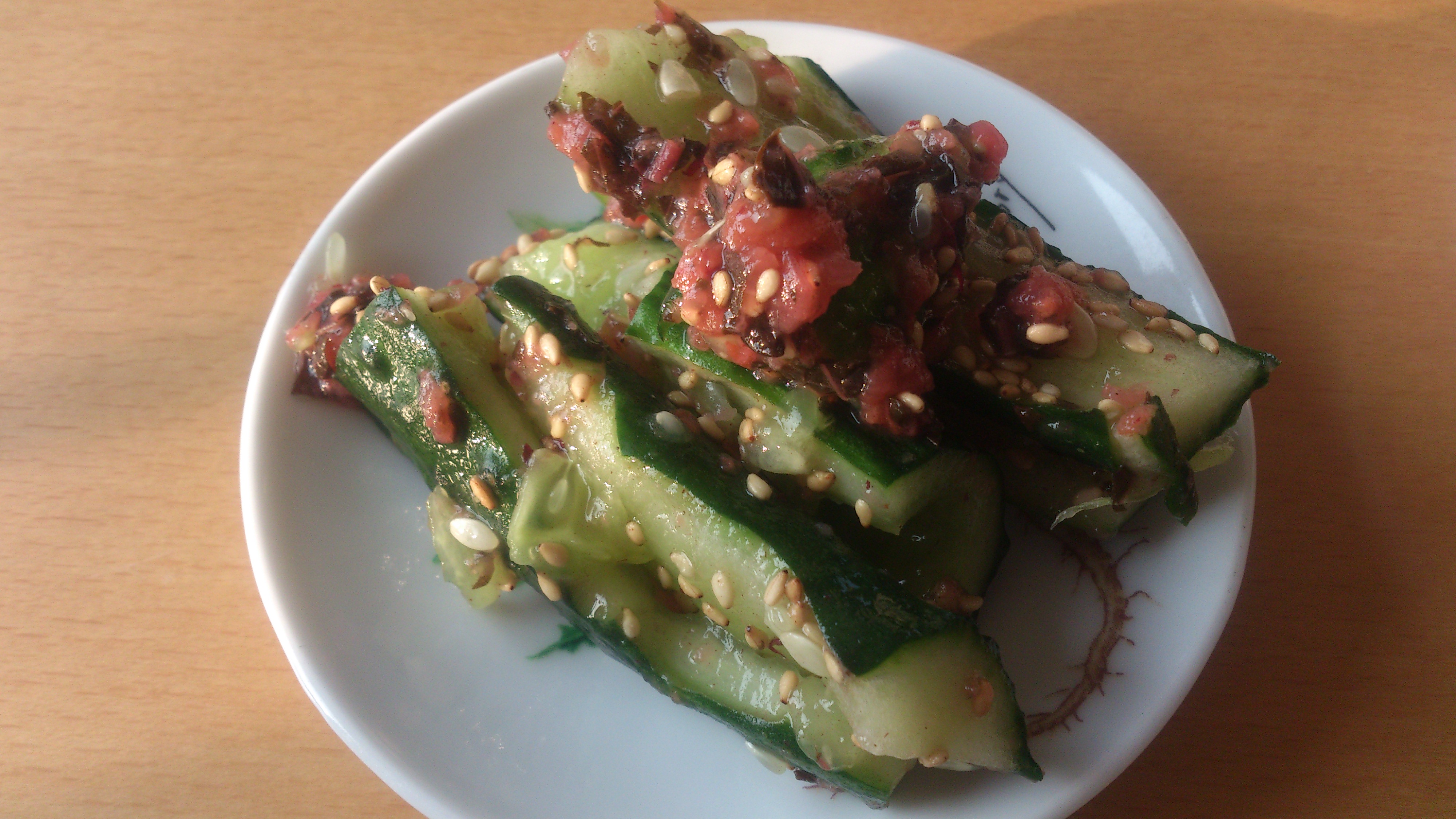 これをねかせたきゅうりと混ぜ、白ごまをたっぷりふりかけると出来上がり。